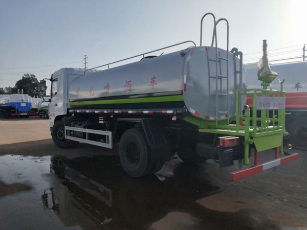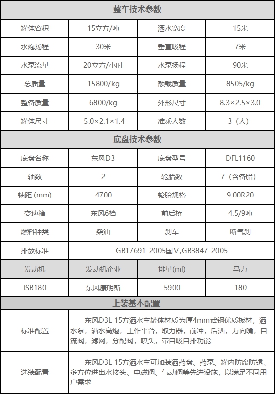 上裝:容積15立方,罐體采用標(biāo)準(zhǔn)Q235碳鋼制作,板材厚度4mm,配大功率專(zhuān)用灑水車(chē),可自吸自排,前沖后灑,側(cè)噴,高位花灑,主管道加粗,直通球閥式消防接口,帶后工作平臺(tái),沖孔平臺(tái),帶高炮。