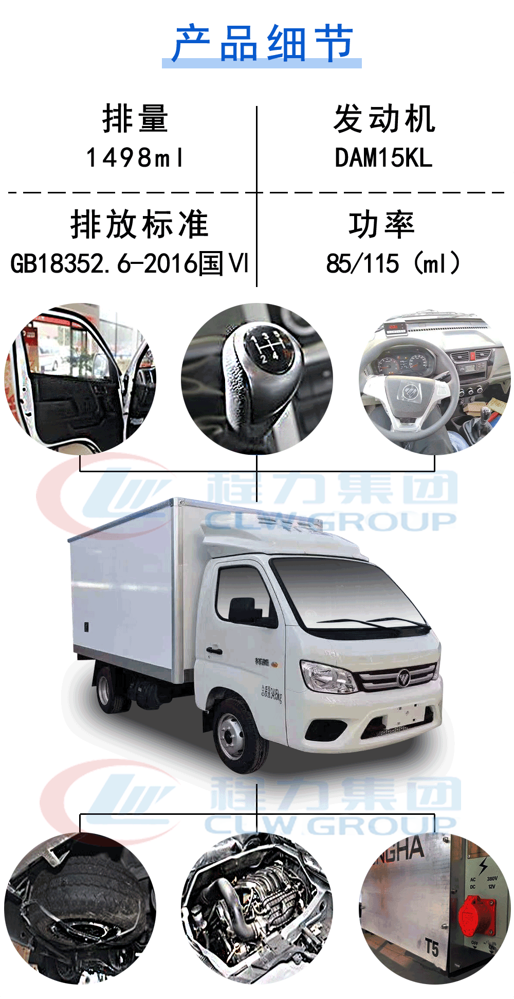 其他貨廂頂部封閉不可開啟.ABS系統控制器型號為YF9,ABS系統控制器生產企業是武漢元豐汽車電控系統有限公司.可選裝無側開門風格貨廂,可選裝導流罩,可選裝反光膜型反光標識.選裝帶前霧燈不帶晝間行駛燈造型,選裝帶前霧燈及晝間行駛燈造型,可選裝黑色裝飾條,可選裝不帶黑色裝飾條.發動機DAM15KL,DAM16KL對應的油耗值分別為8.3L/100km,8.7L/100km,分別對應最高車速100km/h,110km/h.選裝同等功率不同造型的制冷機外觀照片.選裝高位進氣管.選裝后視鏡風格.